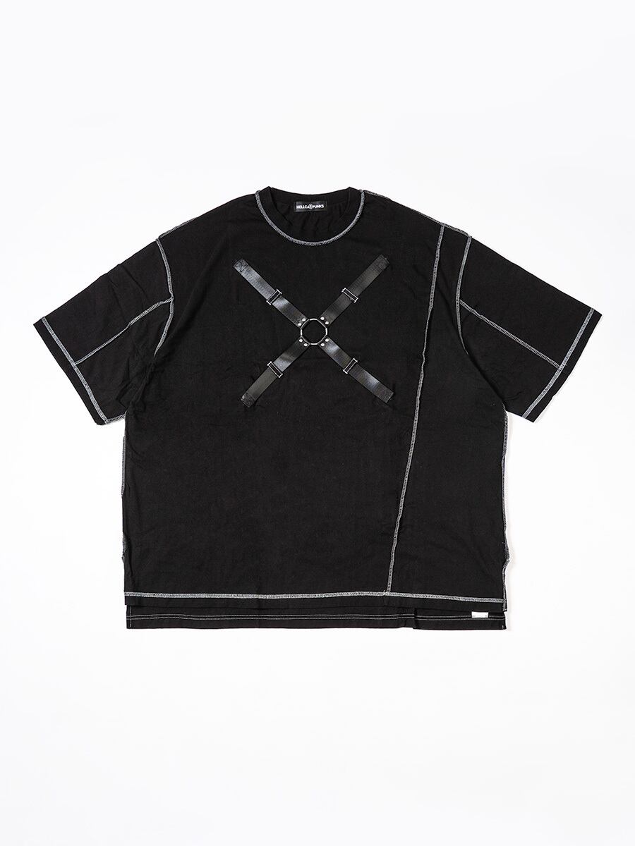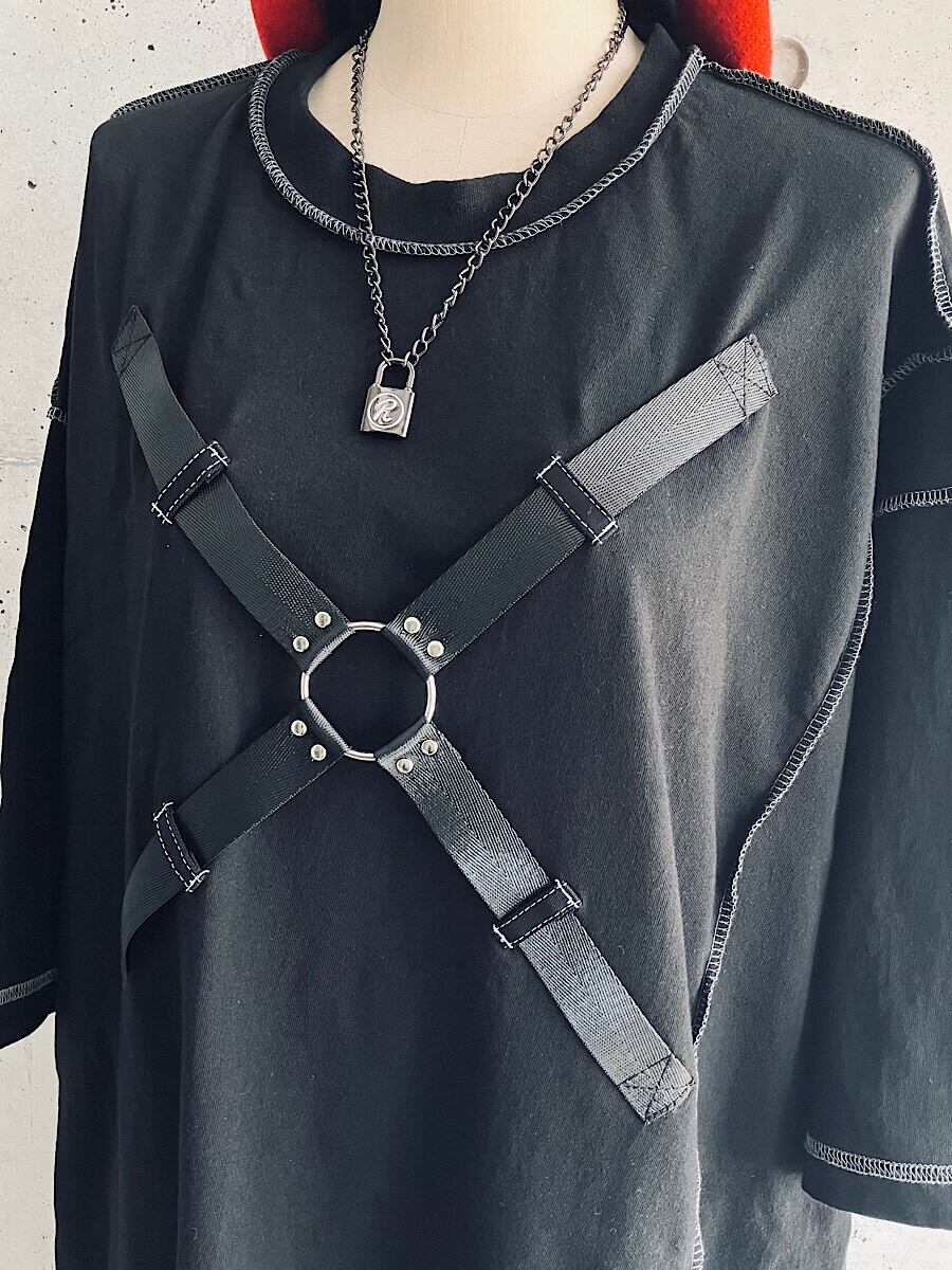オーバーロックとハーネス風のストラップが個性的なTシャツ。