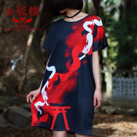 鳥居・狐火・狐尾が方から裾にかけて流れるように